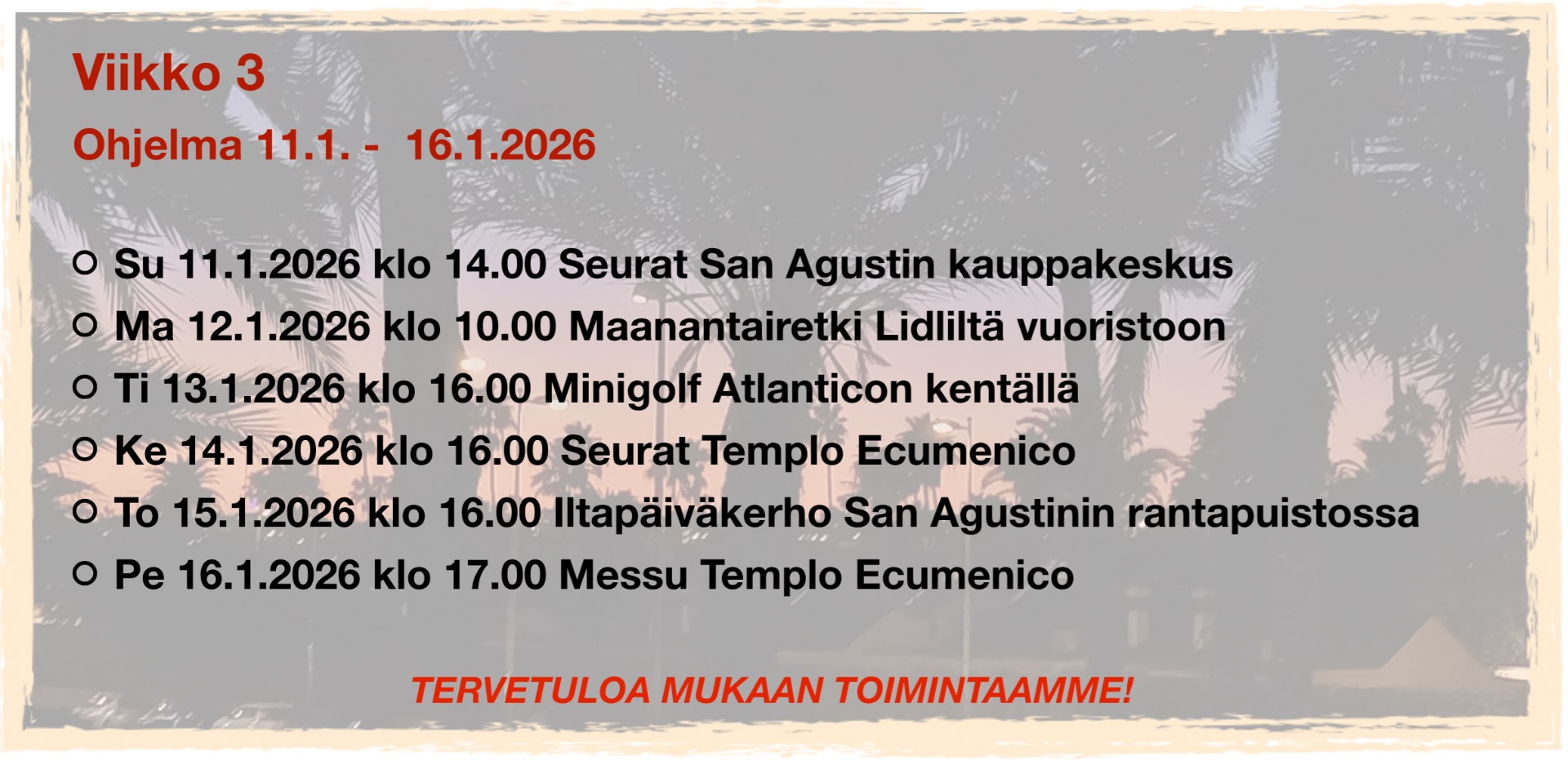 Vanhoillislestadiolaisen yhteisön toimintaan ovat tervetulleita kaikki Gran Canarian saarella lomailevat.