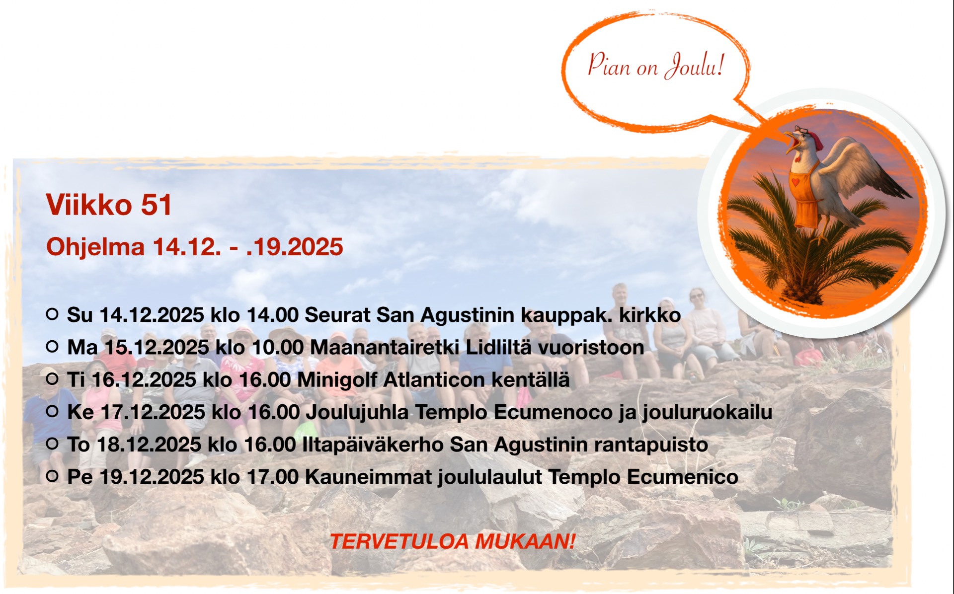 Huom. Perjantaina 12.12.2025 klo 17.0o Kauneimmat joululaulut Templo Ecumenicossa - ei messua!
