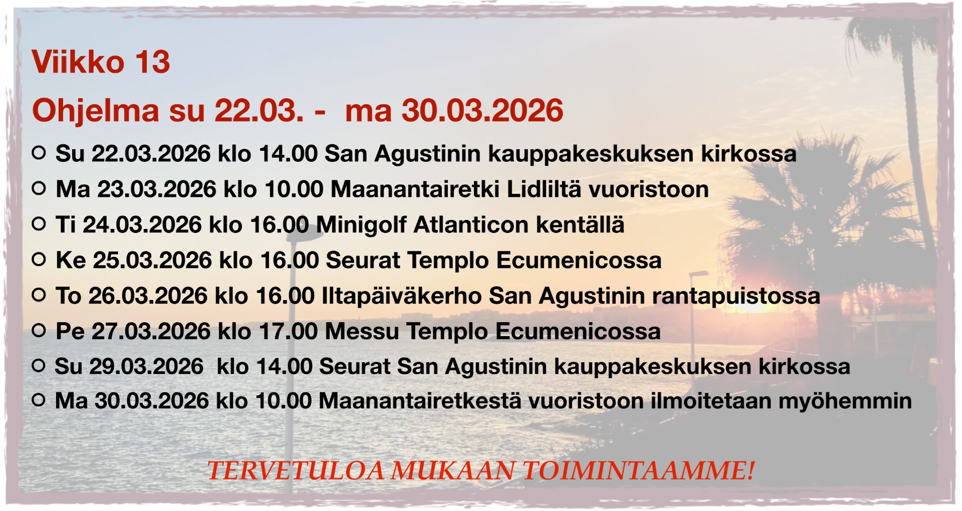 Sananpalvelijana toiminut Vesa aloitti puheensa muistelemalla lyhyesti Telttakatosseurojen historiaa. On mahdollista, että vuonna 2010 alkanut säännöllinen seuratoiminta tässä tilassa ei enää jatku seuraavalla kaudella. Toiveemme on, että kauden 2026–2027 sunnuntaiseurat voidaan järjestää joka sunnuntai San Agustínin kauppakeskuksen kirkossa. Telttakatos on palvellut erinomaisesti seuratoimintaa mutta San Agustinin kirkko tarjoaa siihen vielä paremmat mahdollisuudet.