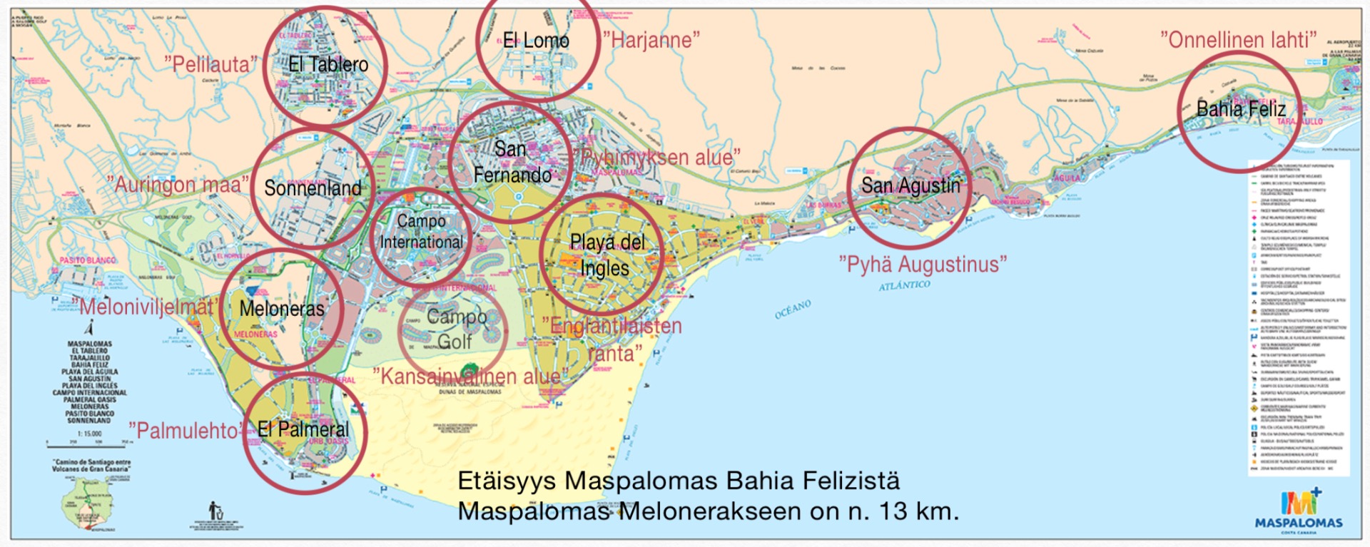 Alueeseen kuuluu kolme erillistä rantaan rajoittuvaa turistialuetta; San Agustin, Playa del Ingles ja Meloneras. Lisäksi paikallisen väestön asutusalue San Fernando palveluineen.